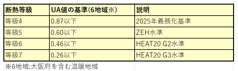 参考までに、UA値の基準を表にまとめてみました。