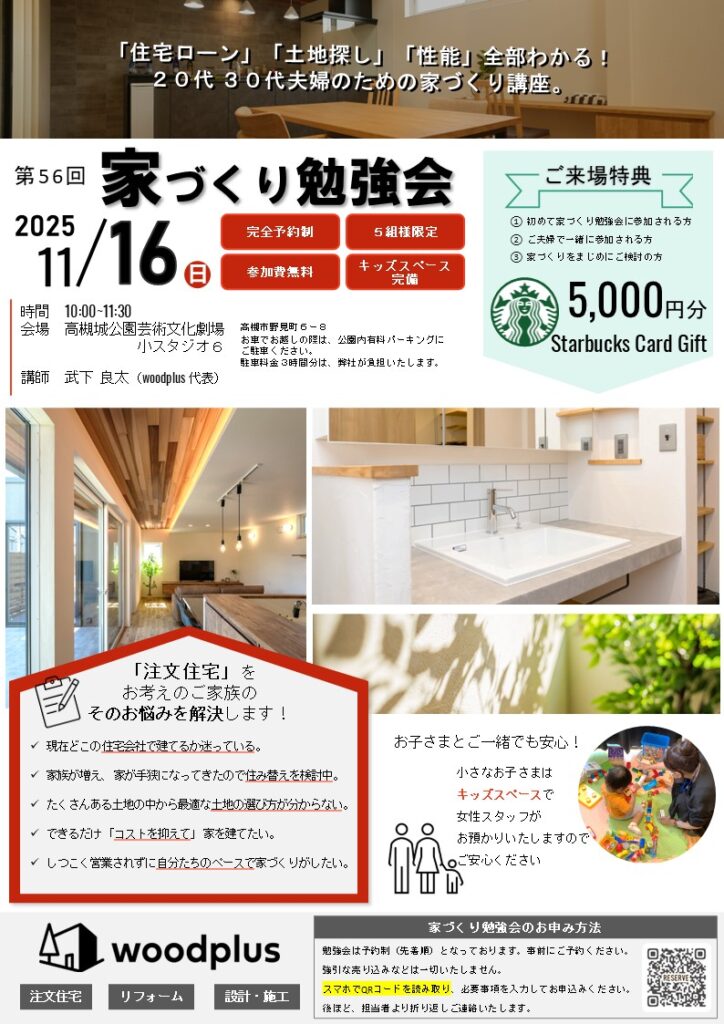 11月16日開催の「家づくり勉強会」では、今回ご紹介した住宅性能のポイントはもちろん、土地の選び方や資金計画の立て方など、家づくりの基本をわかりやすくお伝えします!