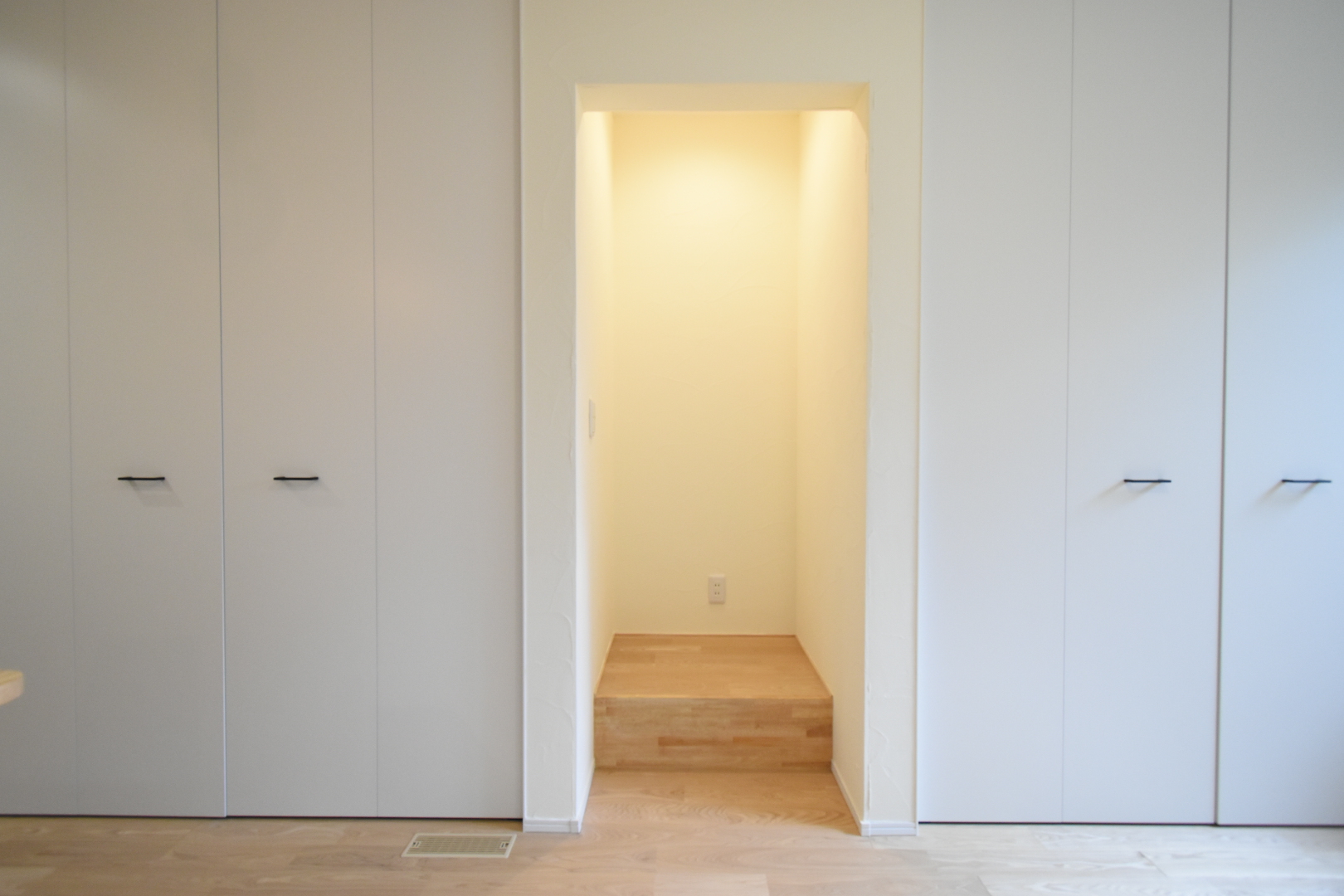 玄関を一緒にする事で広い収納スペースも確保しました。また、3階の廊下には読書好きなご主人様のために本棚とデスクを造作しました。本棚もデスクもご家族で十分に使用できる広さを確保しましたので、一緒に読書をしたり書き物をしたりとご家族のコミュニケーションスペースとして大活躍しそうです。その他、子世帯のお嬢様のお部屋に個別にクローゼットを設ける等、それぞれのプライバシーを守りながら家族のぬくもりを感じられる間取りになっています。