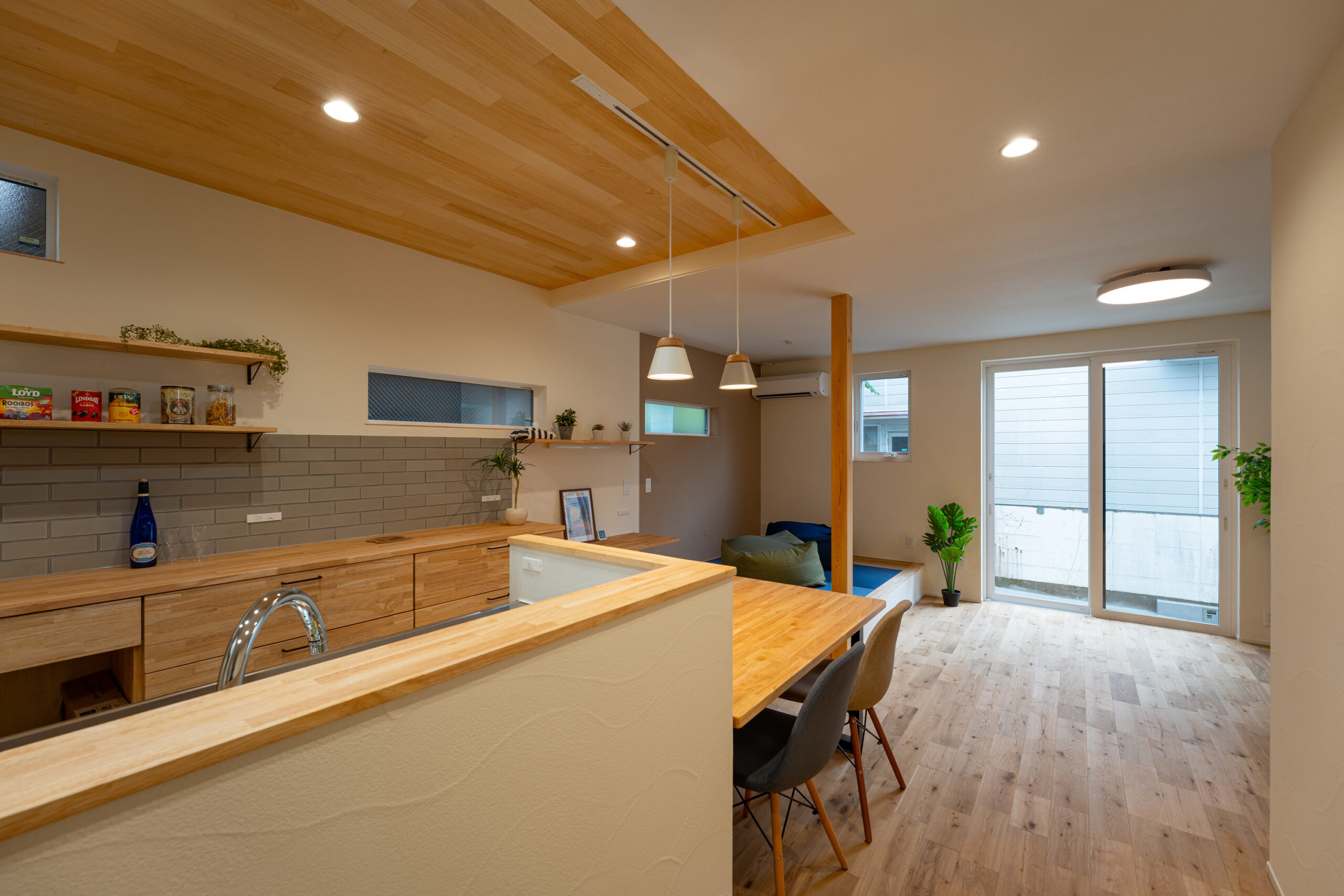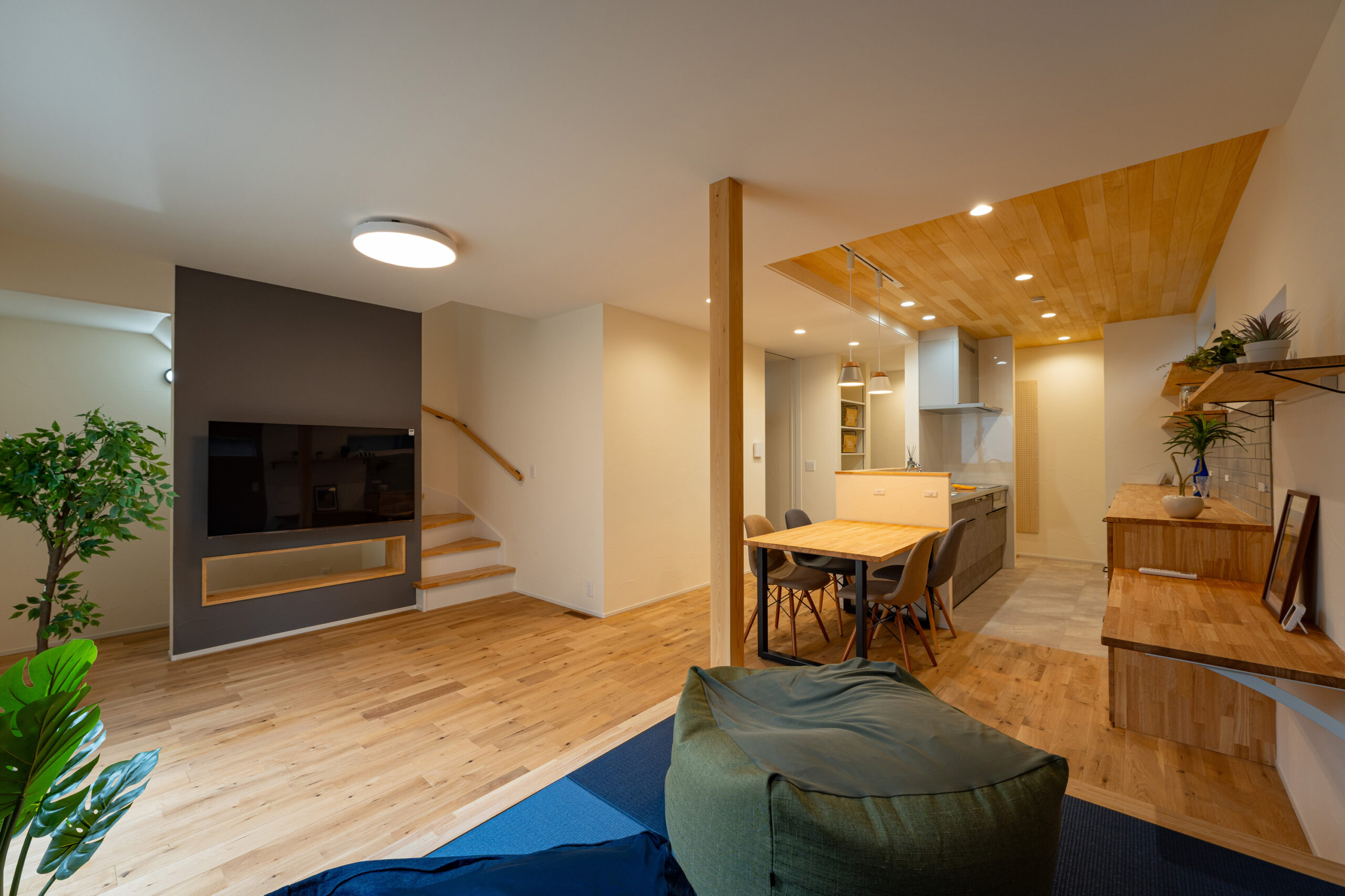 1階のLDKには、お子様のお昼寝や遮びスペースにぴったりな小上がり畳コーナーを設け、引き出し収納でおもちゃもすっきり。テレビ裏には電子機器や書類を隠せる収納棚を造作し、生活感を上手に目隠ししています。