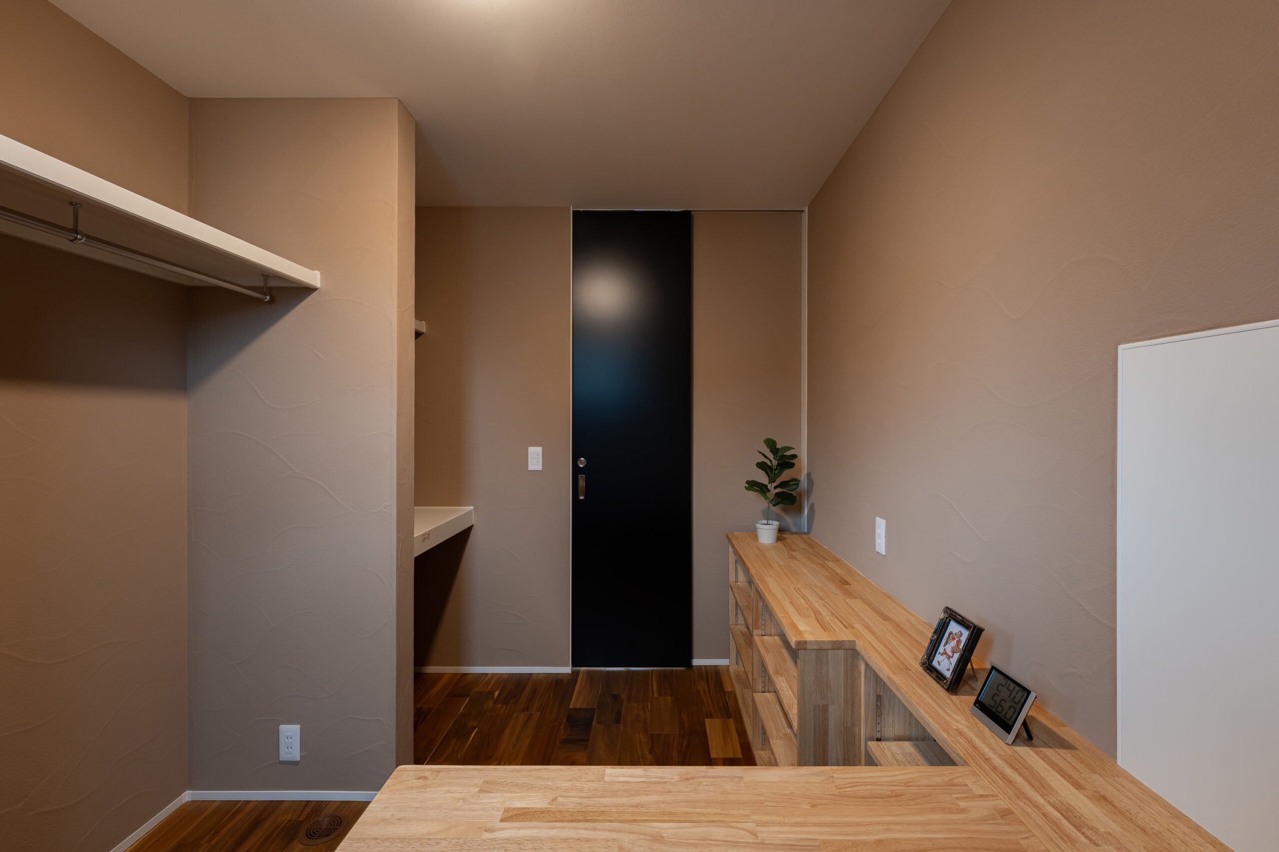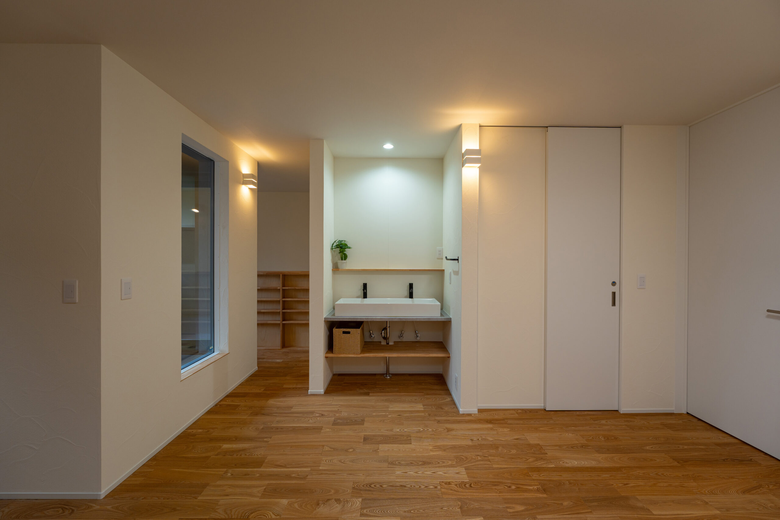 テラスでのBBQを楽しむために設けた造作洗面台、本好きなご家族のための廊下の造作本棚、ご主人のリモートワーク用デスク。家族それぞれの「好き」と「快適」を叶える工夫が詰まっています。