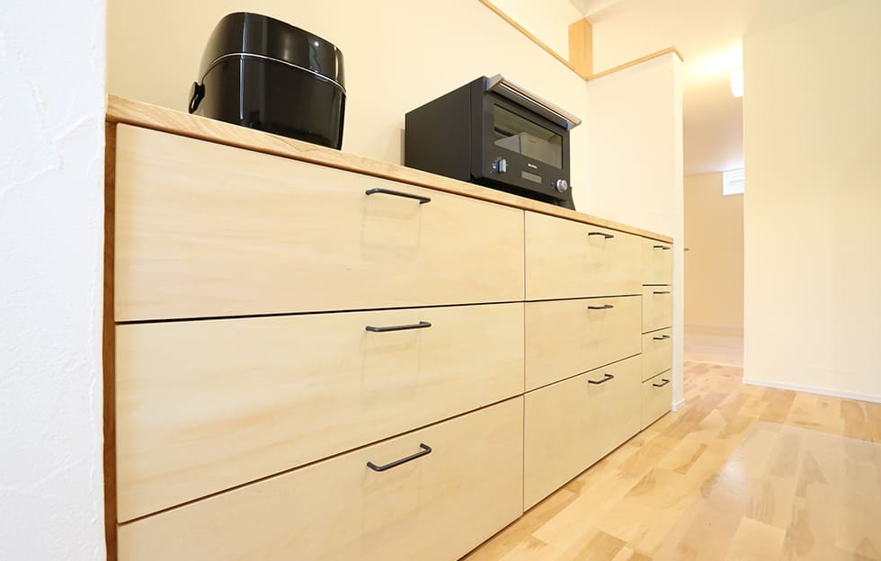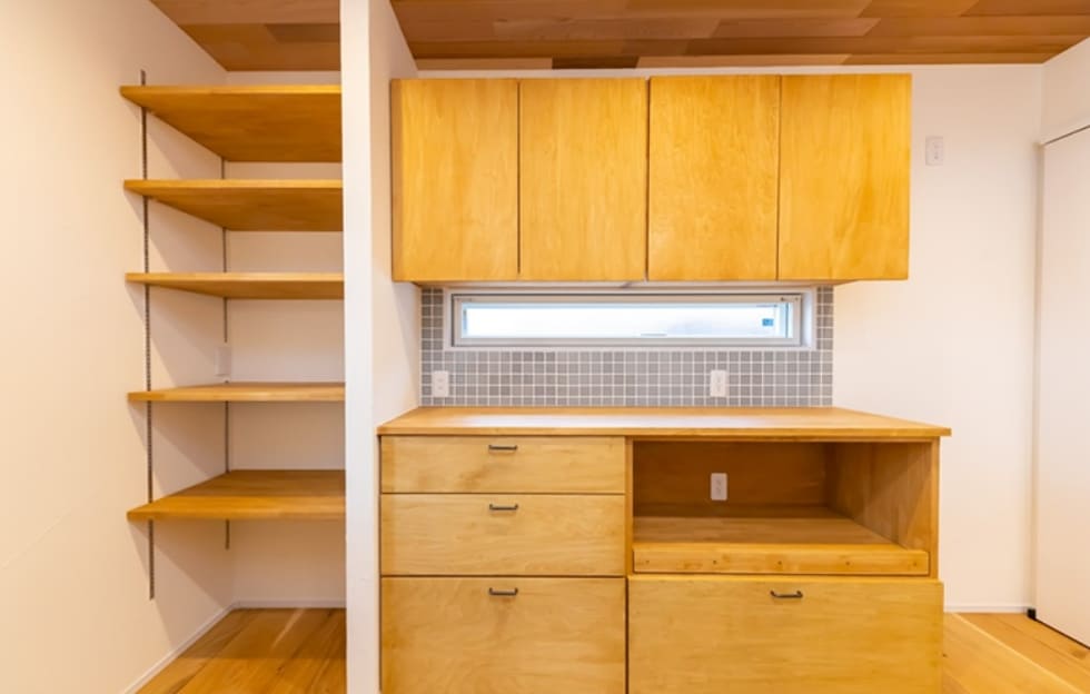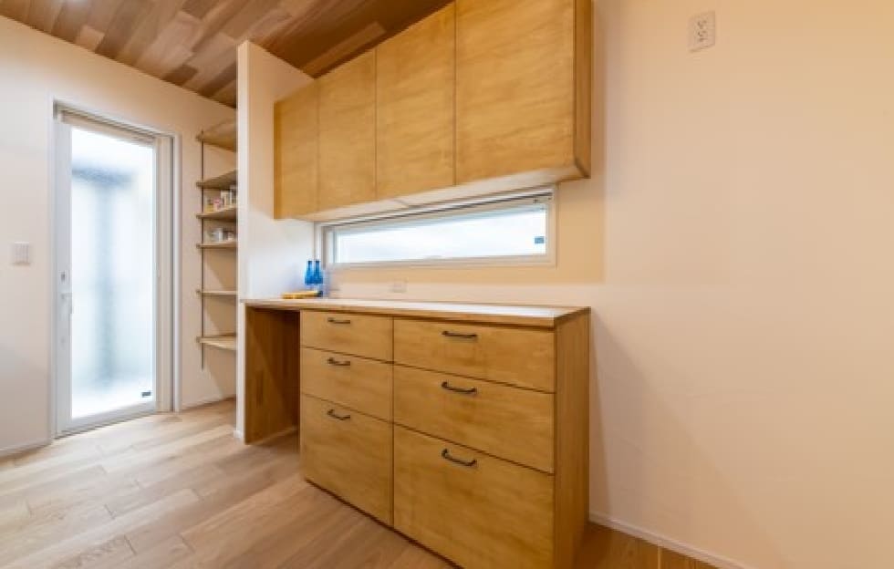 キッチンの背面スペースを造作収納で有効活用し、空間になじむようにデザイン。機能性とデザイン性の両方を備えており、日々の生活をより快適にします。