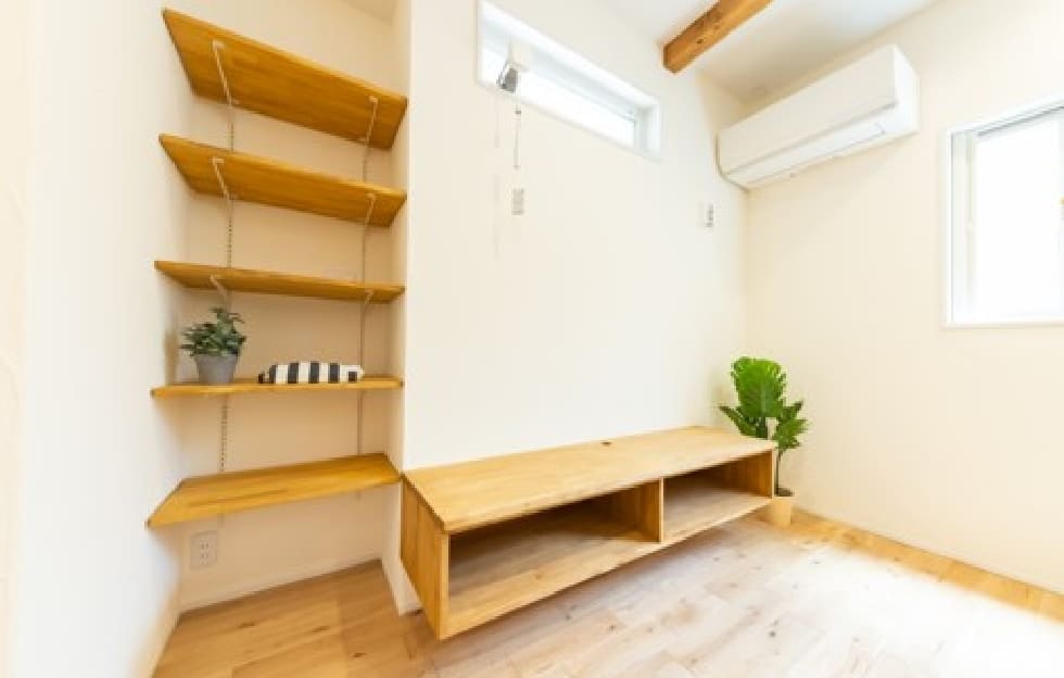 玄関のスペースに最適化されたシューズラックや収納棚は、靴や小物をすっきり整理できます。限られた空間を効率的に使い、見た目もすっきり。