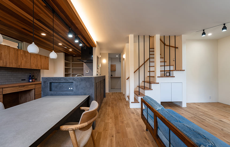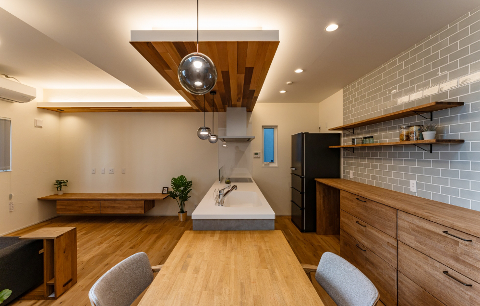 天井にすこし段差をつけて立体的に見せることで空間に広がりを演出。また木色合いと質感が空間に温かみを与え、間接照明によって柔らかい光が木目を引き立て居心地の良い空間になります。