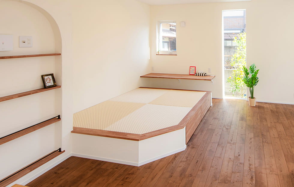家族や友人たちとくつろぐ場所や、読書やお昼寝スペースとして最適です。また小上がり部分を収納にでき限られた空間を有効活用できます。