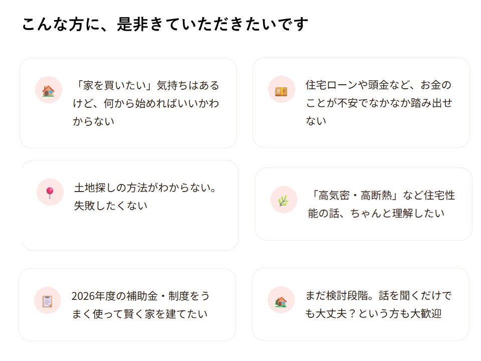 事務所から車で1時間圏内にエリアを絞っているのは、お引き渡し後に何か不具合や困ったことがあった際、すぐに駆けつけられる距離感を大切にしているからです。